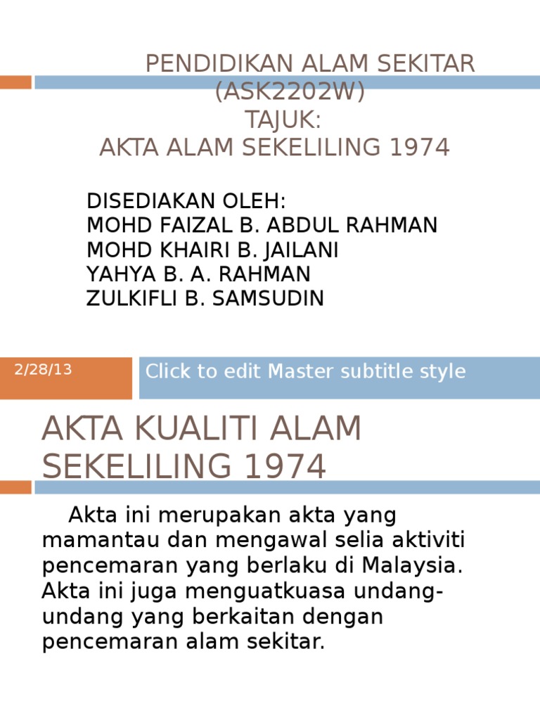 Linked data more info about linked data. Mymemory, world's pihak industri perlulah memberi kerjasama sebaik mungkin dan mematuhi akta kualiti alam sekeliling 1974 di mana akta ini digubal bagi meningkatkan kualiti alam sekitar dan. Akta kualiti alam sekeliling 1974 akta 127 juga menetapkan syarat untuk mendapat kebenaran pihak berkuasa yang berkaitan sebelum sesuatu aktiviti dilakukan. Seksyen 34a, akta kualiti alam sekeliling (akas) 1974. Sekeliling akta , menteri, setelah berunding.